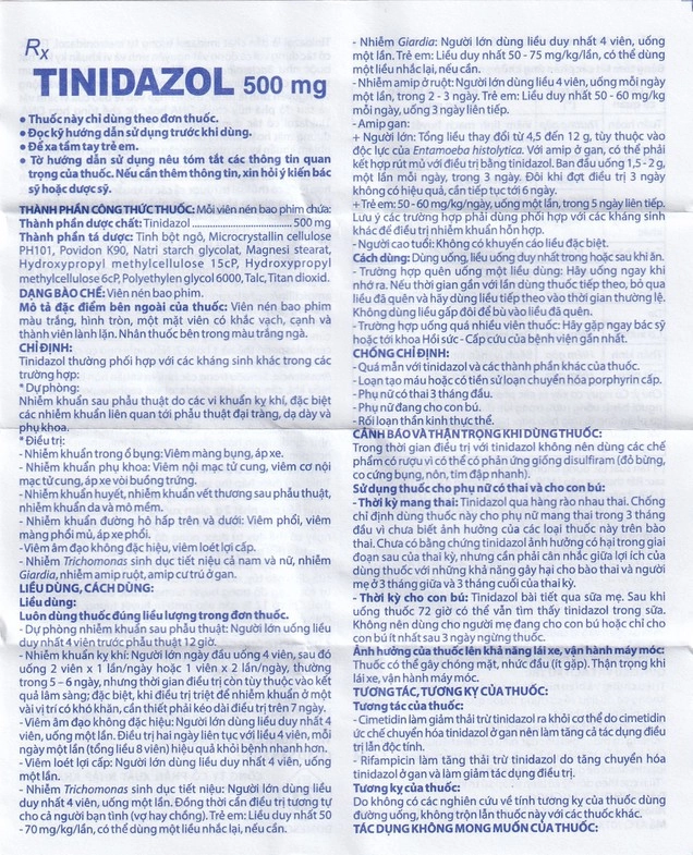 - Tinidazol bài tiết qua sữa mẹ. Sau khi uống thuốc 72 giờ có thể vẫn tìm thấy tinidazol trong sữa. Không nên dùng cho người mẹ đang cho con bú hoặc chỉ cho con bú ít nhất sau 3 ngày ngừng thuốc.