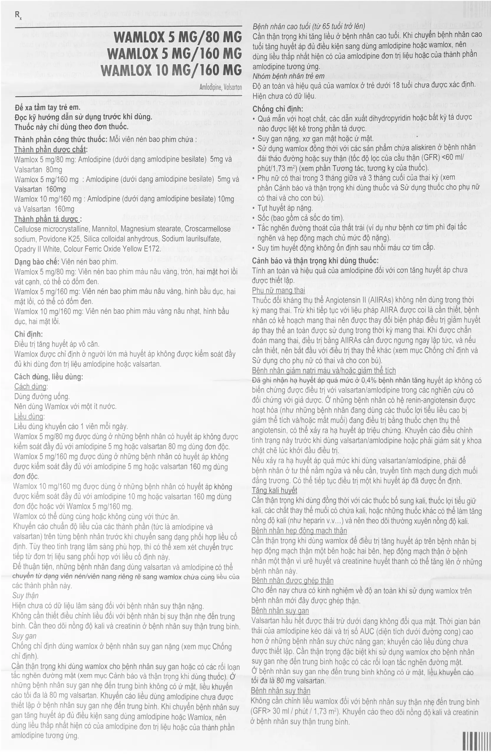 - Wamlox 5 mg/80 mg được dùng ở những bệnh nhân có huyết áp không được kiểm soát đầy đủ với amlodipine 5 mg hoặc valsartan 80 mg dùng đơn độc. Wamlox 5 mg/160 mg được dùng ở những bệnh nhân có huyết áp không được kiểm soát đầy đủ với amlodipine 5 mg hoặc valsartan 160 mg dùng đơn độc.