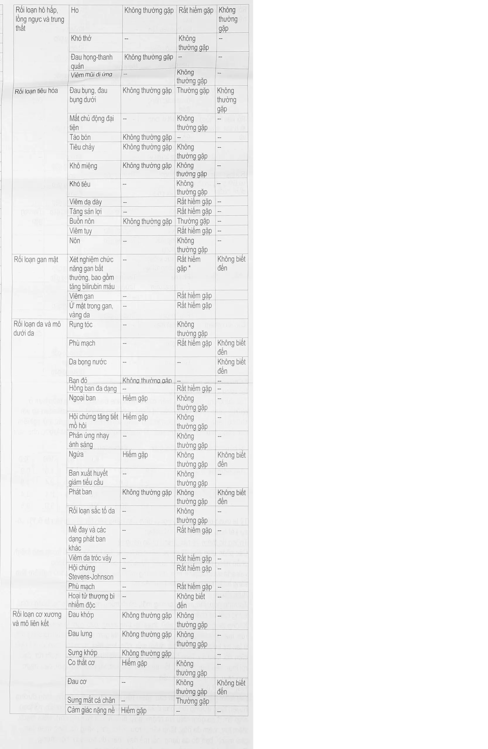 Các phản ứng phụ của thuốc được xếp vào nhóm tần suất theo quy ước sau: Rất thường gặp (≥ 1/10); thường gặp (≥ 1/100 đến <1/10); không thường gặp (≥ 1/1.000 đến <1/100); hiếm gặp (≥ 1/10.000 đến <1/1.000); rất hiếm gặp (<1/10.000); không biết đến (không thể ước tính từ dữ liệu có sẵn).