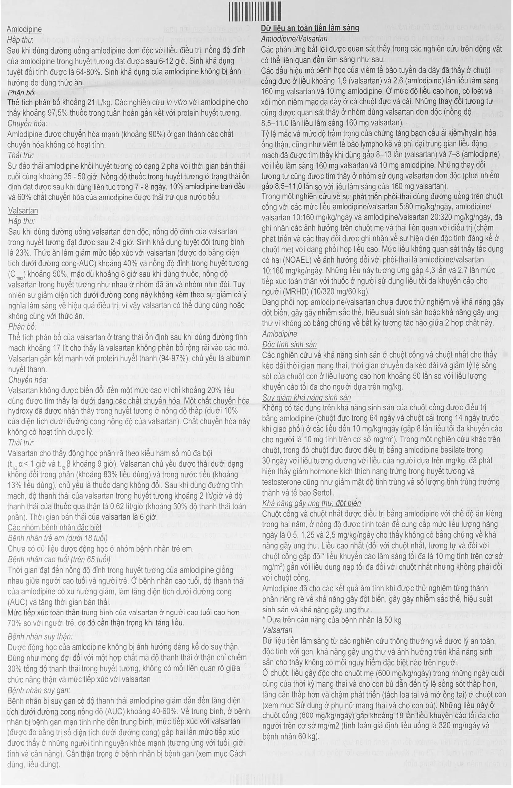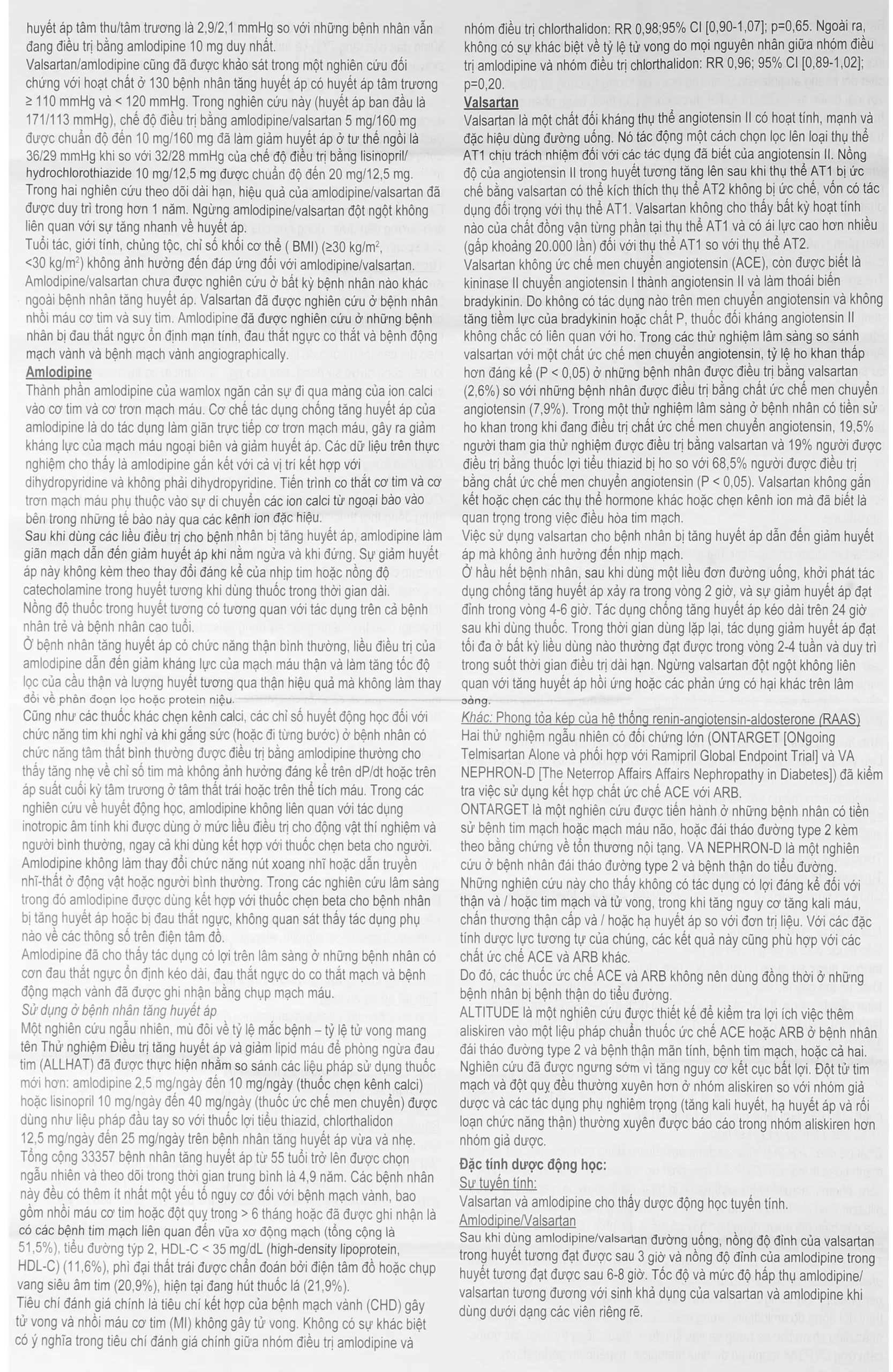 - Một thử nghiệm đa trung tâm, ngẫu nhiên, mù đôi, có đối chứng với hoạt chất, nhóm song song đã cho thấy huyết áp trở và bình thường (huyết áp tâm trương thấp nhất ở tư thế ngồi < 90 mmHg vào cuối cuộc thử nghiệm) trên những bệnh nhân có huyết áp không được kiểm soát đầy đủ khi đang điều trị bằng amlodipine 10 mg ở 78% bệnh nhân được điều trị bằng amlodipine/valsartan 10/160 mg, so với 67% bệnh nhân vẫn đang điều trị bằng amlodipine 10 mg. Sự cộng thêm valsartan 160 mg đã làm giảm thêm huyết áp tâm thu tâm trương là 2,9/2,1 mmHg so với những bệnh nhân văn đang điều trị bằng amlodipine 10 mg duy nhất. Valsartan/amlodipine cũng đã được khảo sát trong một nghiên cứu đối chứng với hoạt chất ở 130 bệnh nhân tăng huyết áp có huyết áp tâm trương 2 110 mmHg và < 120 mmHg. Trong nghiên cứu này (huyết áp ban đầu là 171/113 mmHg), chế độ điều trị bằng amlodipine/valsartan 5 mg/160 mg được chuẩn độ đến 10 mg/160 mg đã làm giảm huyết áp ở tư thế ngồi là 36/29 mmHg khi so với 32/28 mmHg của chế độ điều trị bằng lisinopril/hydrochlorothiazide 10 mg/12.5 mg được chuẩn độ đến 20 mg/12,5 mg.