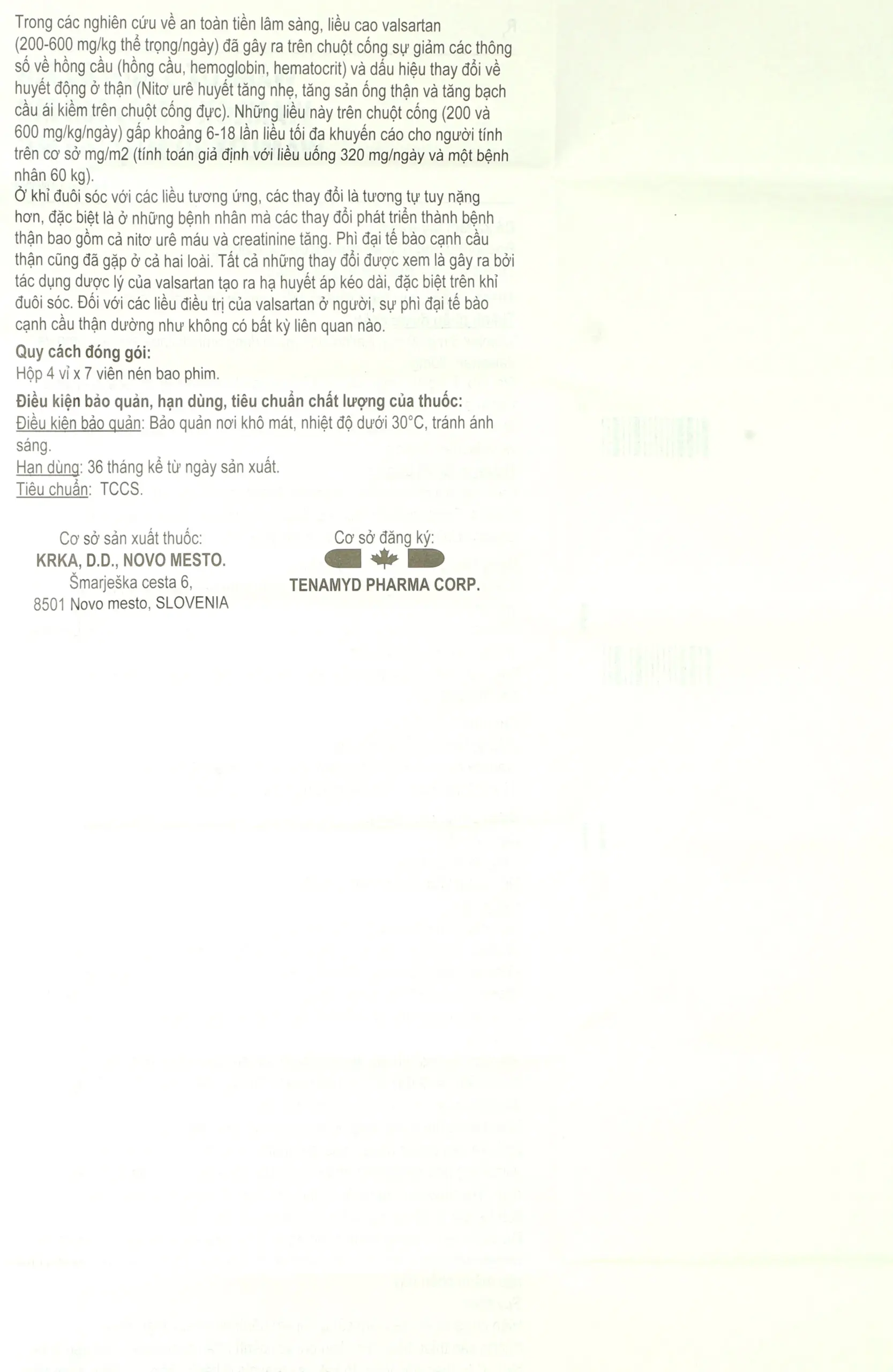 - Trong các nghiên cứu về an toàn tiền lâm sàng, liều cao valsartan (200-600 mg/kg thể trọng/ngày) đã gây ra trên chuột cống sự giảm các thông số về hồng cầu (hồng cầu, hemoglobin, hematocrit) và dấu hiệu thay đổi về huyết động ở thận (Nitơ urê huyết tăng nhẹ, tăng sản ống thận và tăng bạch cầu ái kiềm trên chuột cống đực). Những liều này trên chuột cống (200 và 600 mg/kg/ngày) gấp khoảng 6-18 lần liều tối đa khuyến cáo cho người tính trên cơ sở mg/m2 (tính toán giả định với liều uống 320 mg/ngày và một bệnh nhân 60 kg).